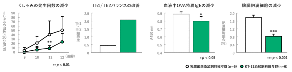 マウスにKT-11を予め投与しておくことで、アレルギー性鼻炎の症状が改善されることが確認されました。