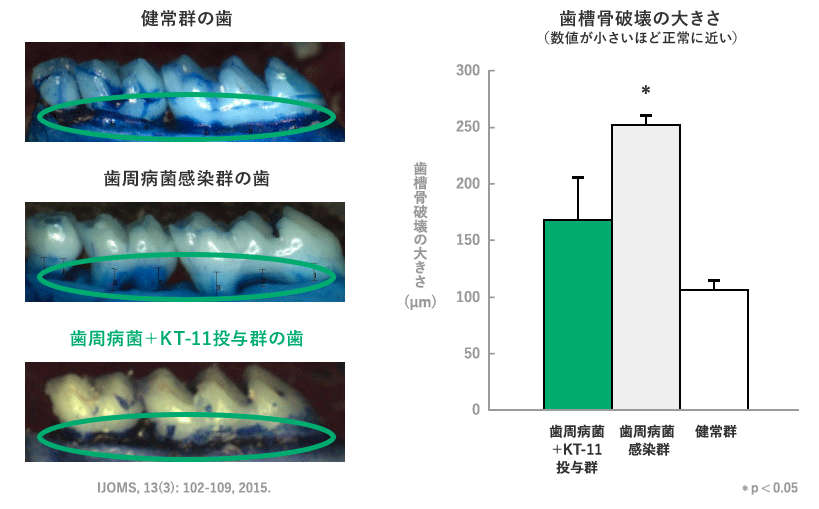 マウスにKT-11を予め4週間投与してから歯周病菌(Porphyromonas gingivalis)を感染させた結果、